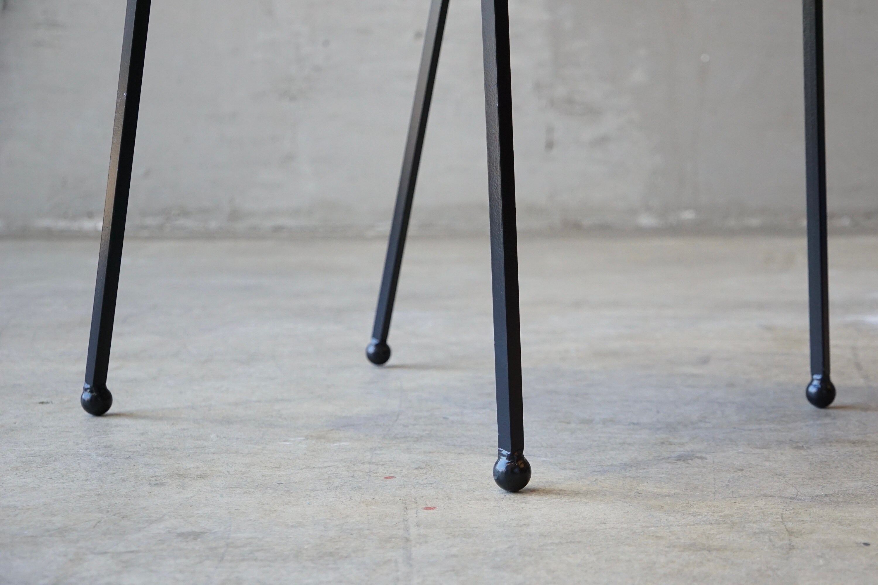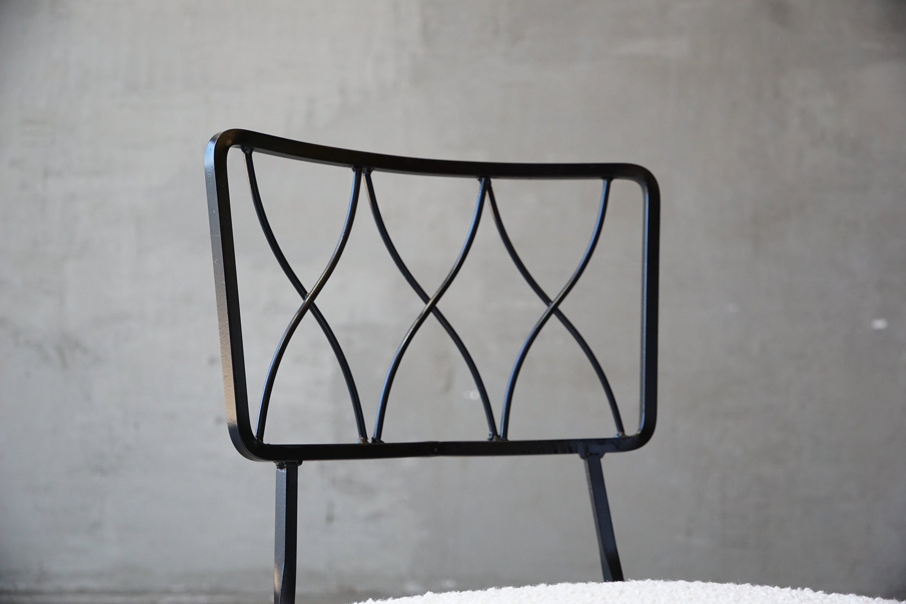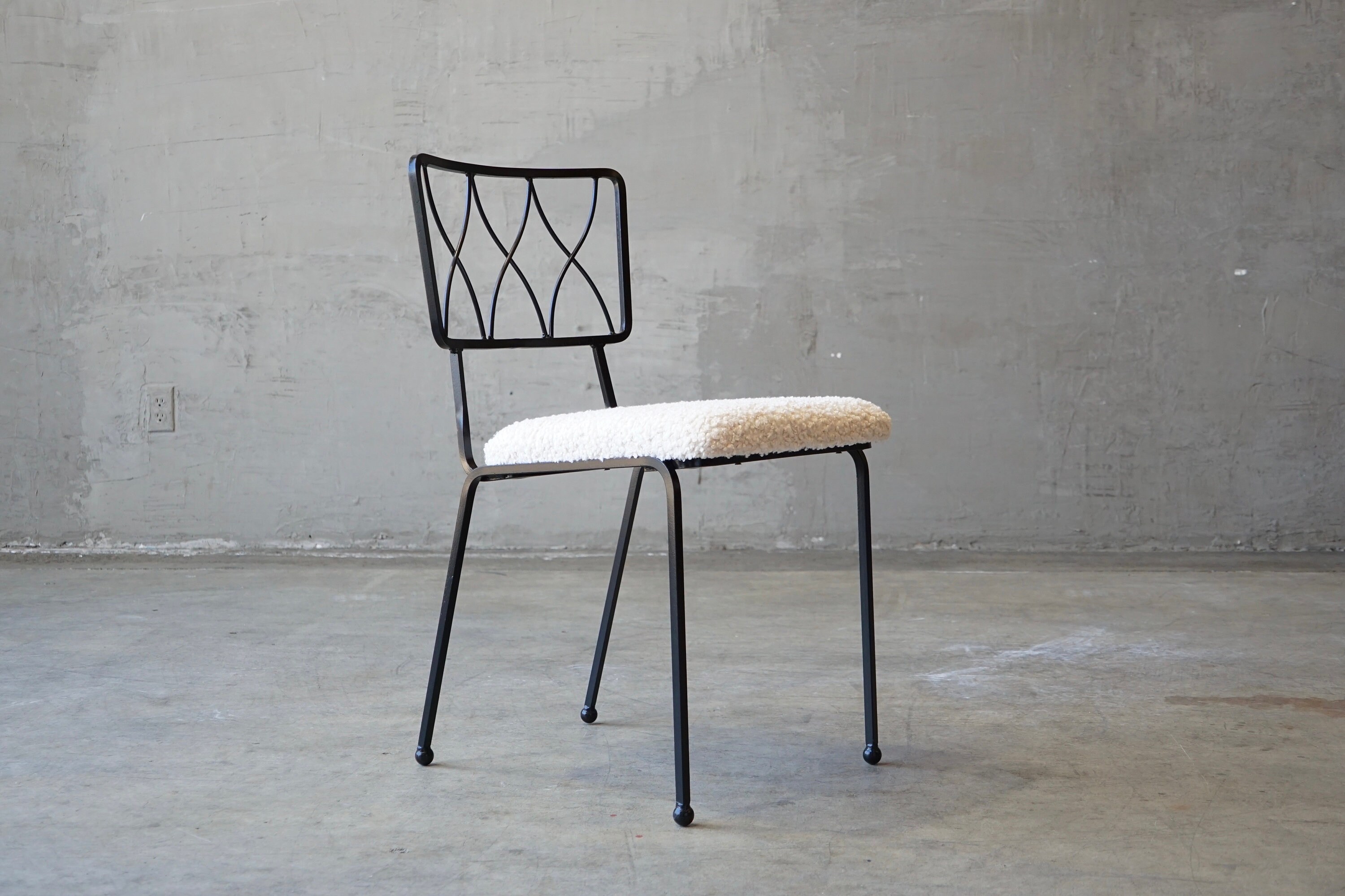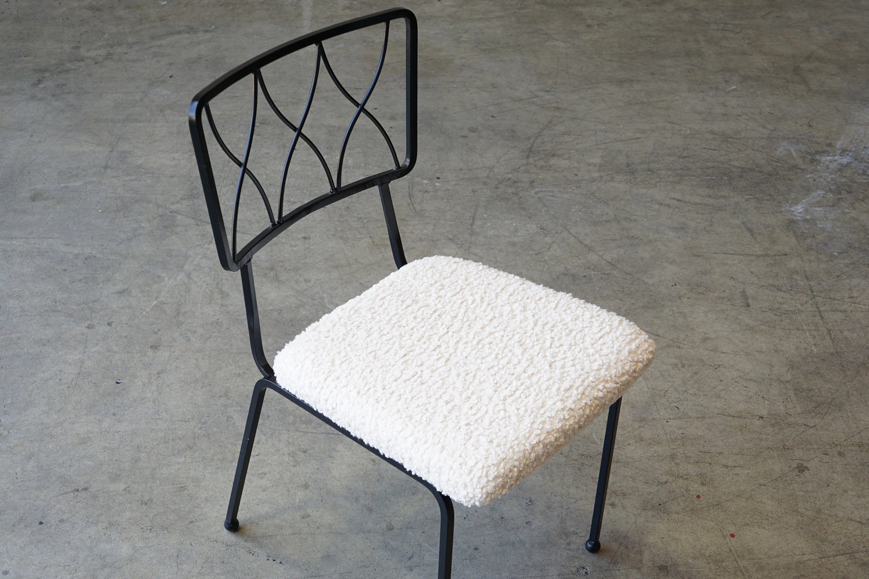 Single Royere styled iron dining or side chair by unknown designer, circa 1950s. Frame has been powdercoated in satin black and seat has been upholstered in new Boucle upholstery.