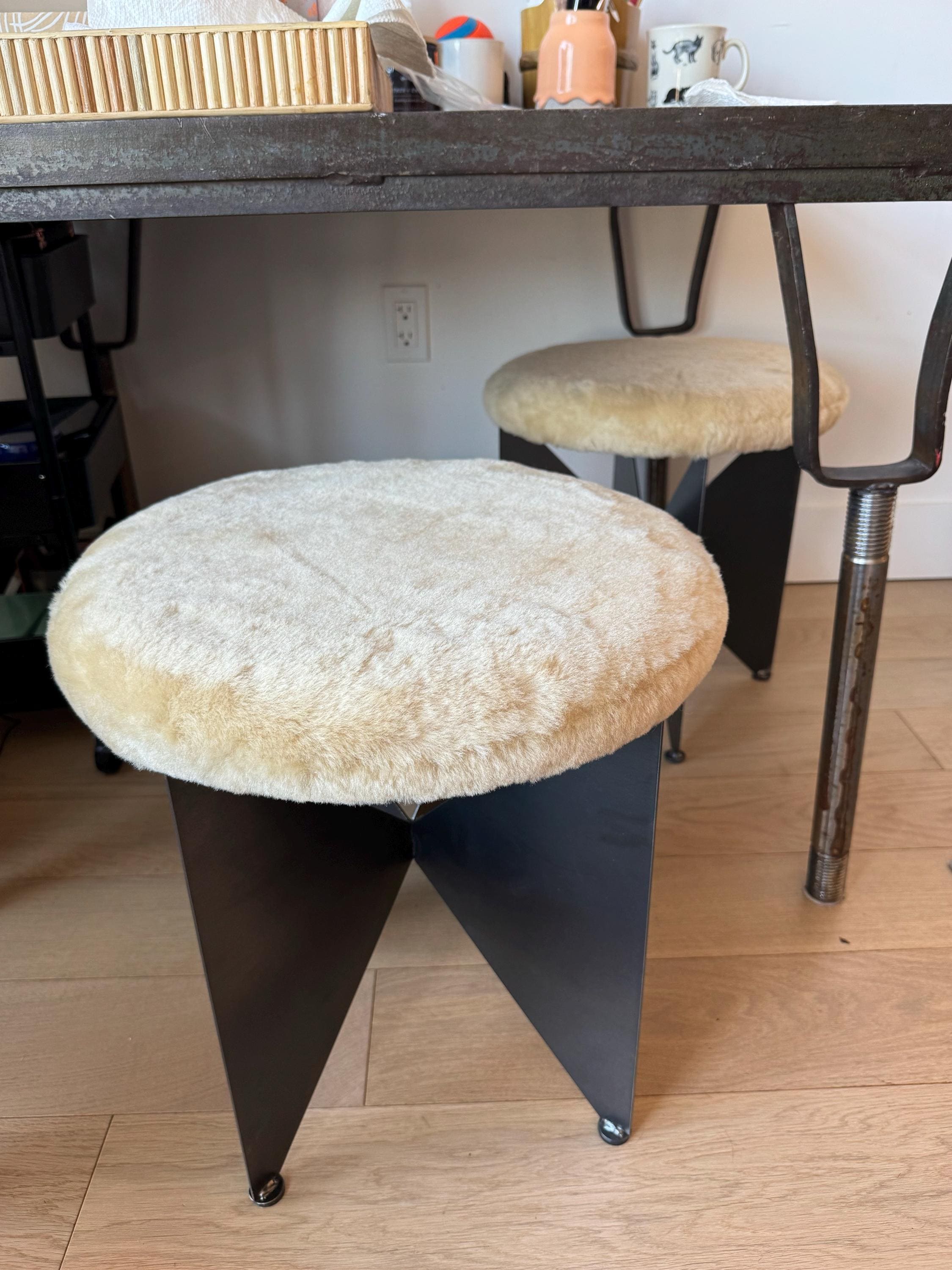 Available for immediate shipping in our photographed leather or shearling. If you'd like to specificity another of our fabrics, discuss powder coating or custom dimensions, please contact us directly.