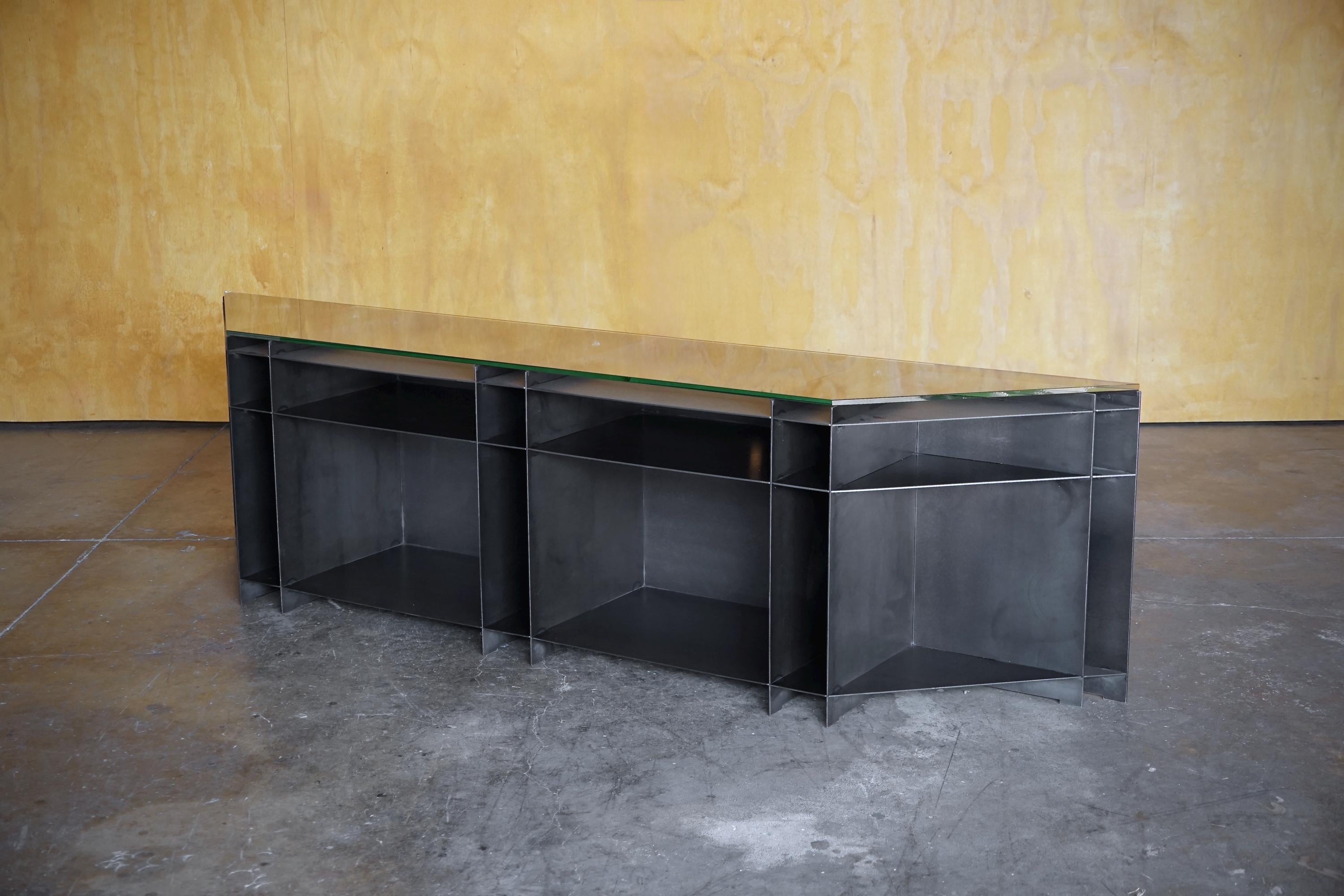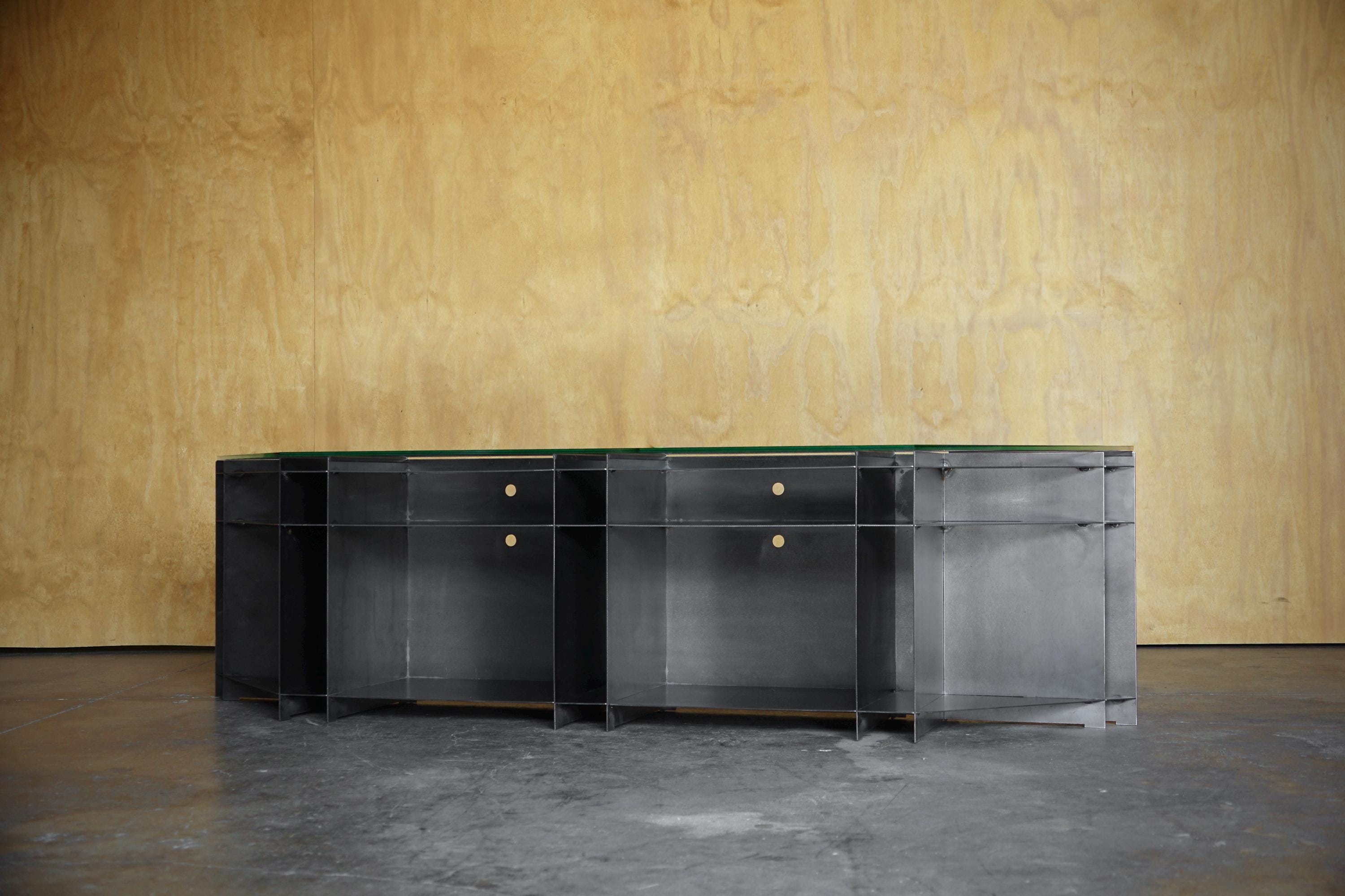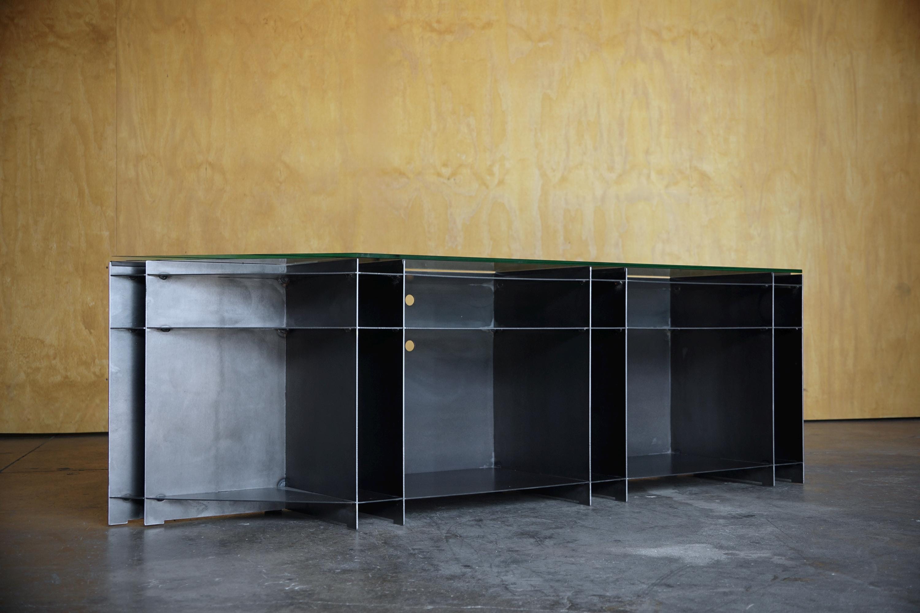 The cabinet’s open internal geometry creates a bold visual rhythm while offering generous storage for books, records, objects, or everyday essentials. The steel is computer precision cut, then hand sanded, welded and oiled to preserve subtle variations and marks that make each piece one of a kind. The glass top adds contrast and lightness, allowing the structure beneath to remain fully visible.