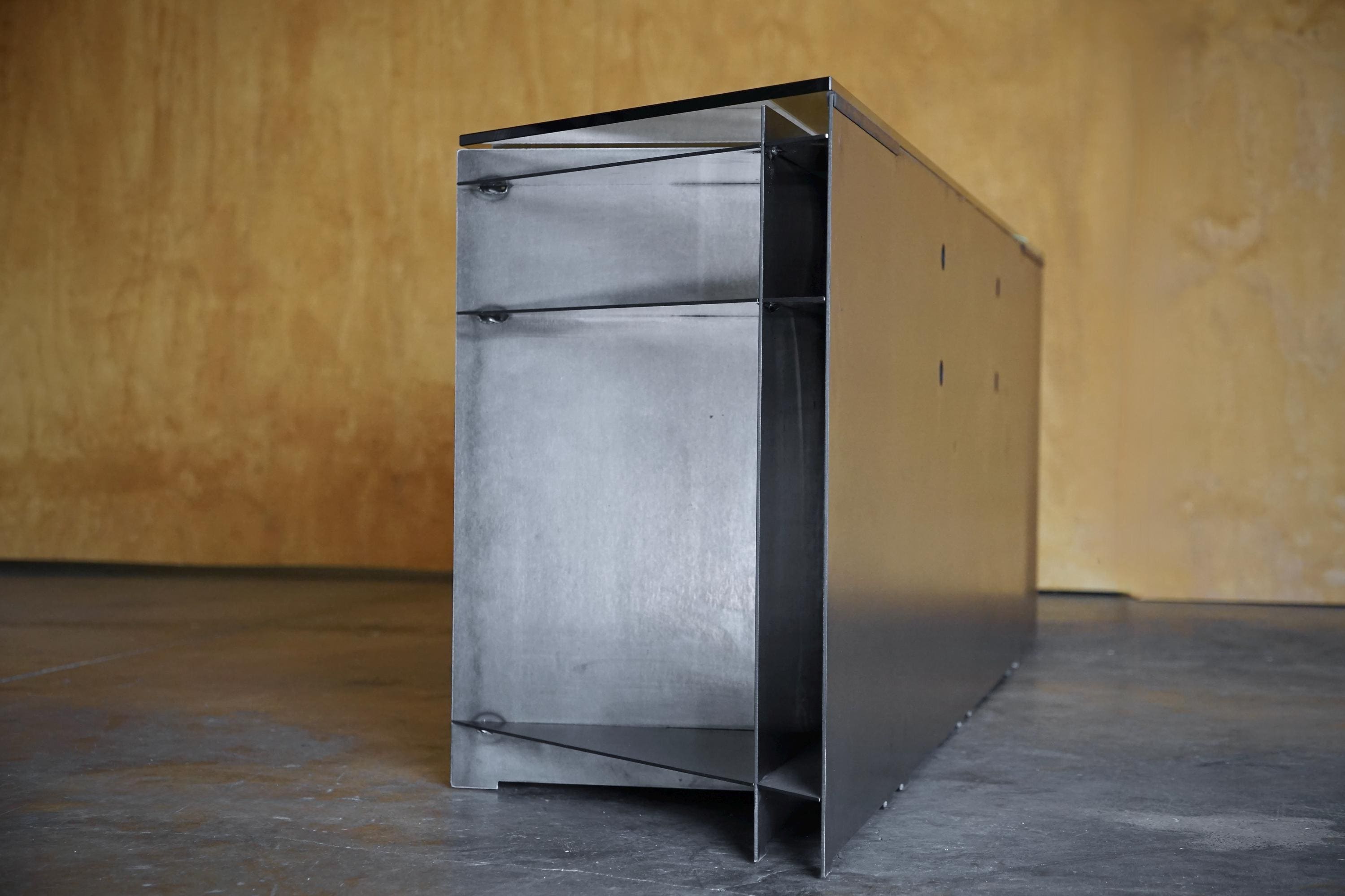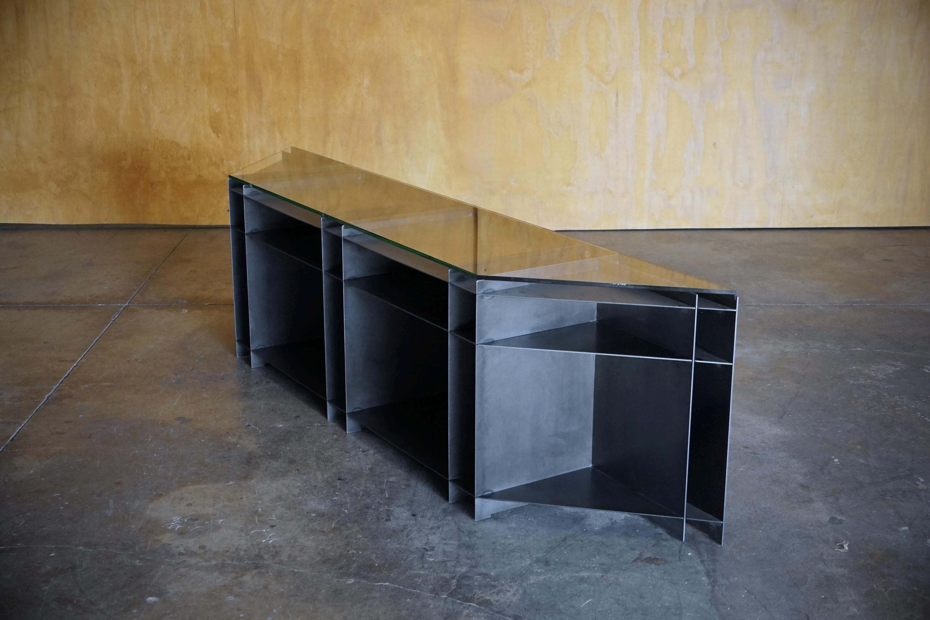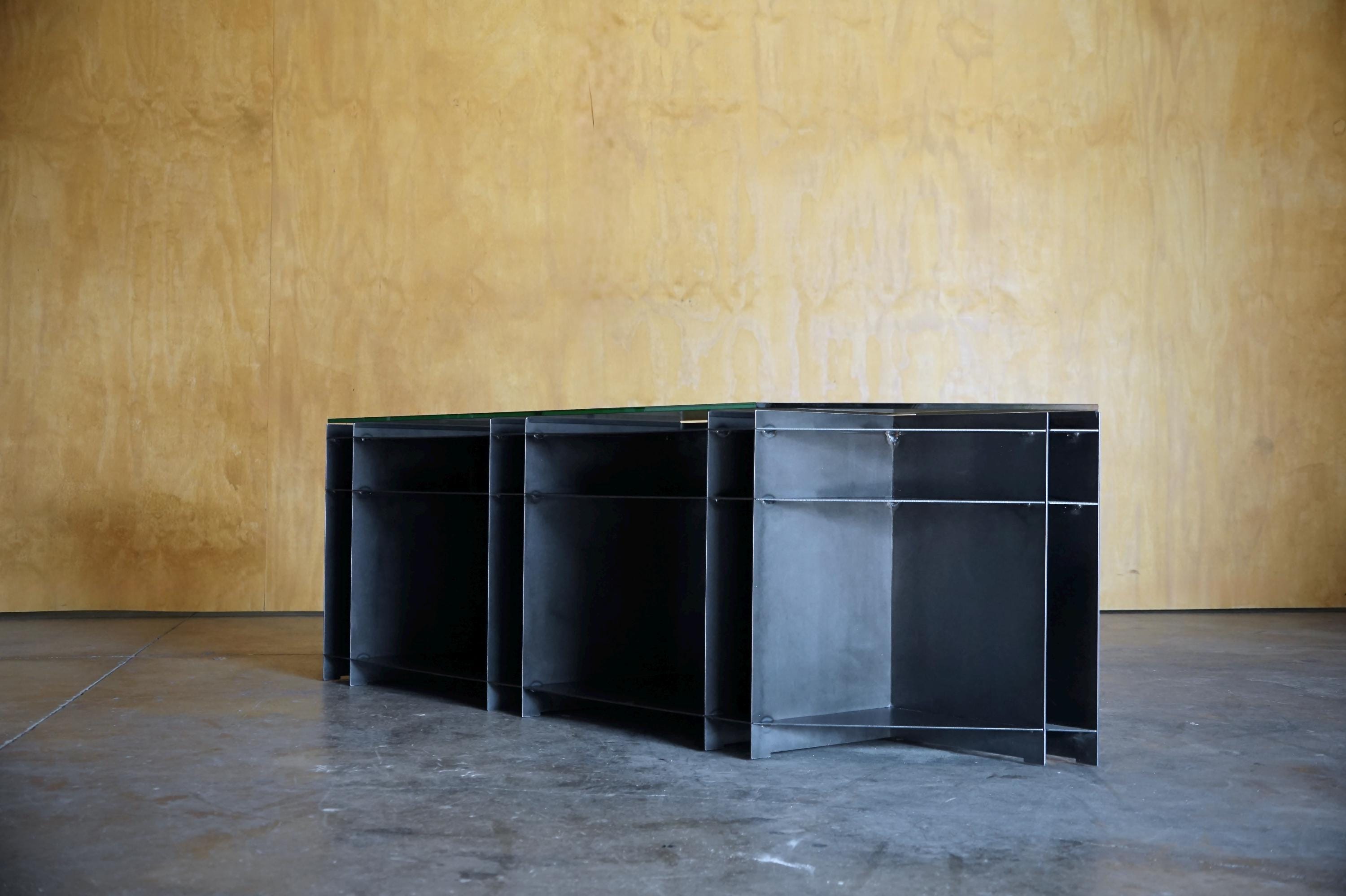 Our 'p30' console is a study in structure, proportion, and material honesty. Hand-crafted from plasma-cut 12-gauge steel and topped with a clean 1/4" thick glass surface, it blends architectural inspiration with functional storage. Every line, edge, and compartment is intentionally designed—no ornamentation, just form doing the work.