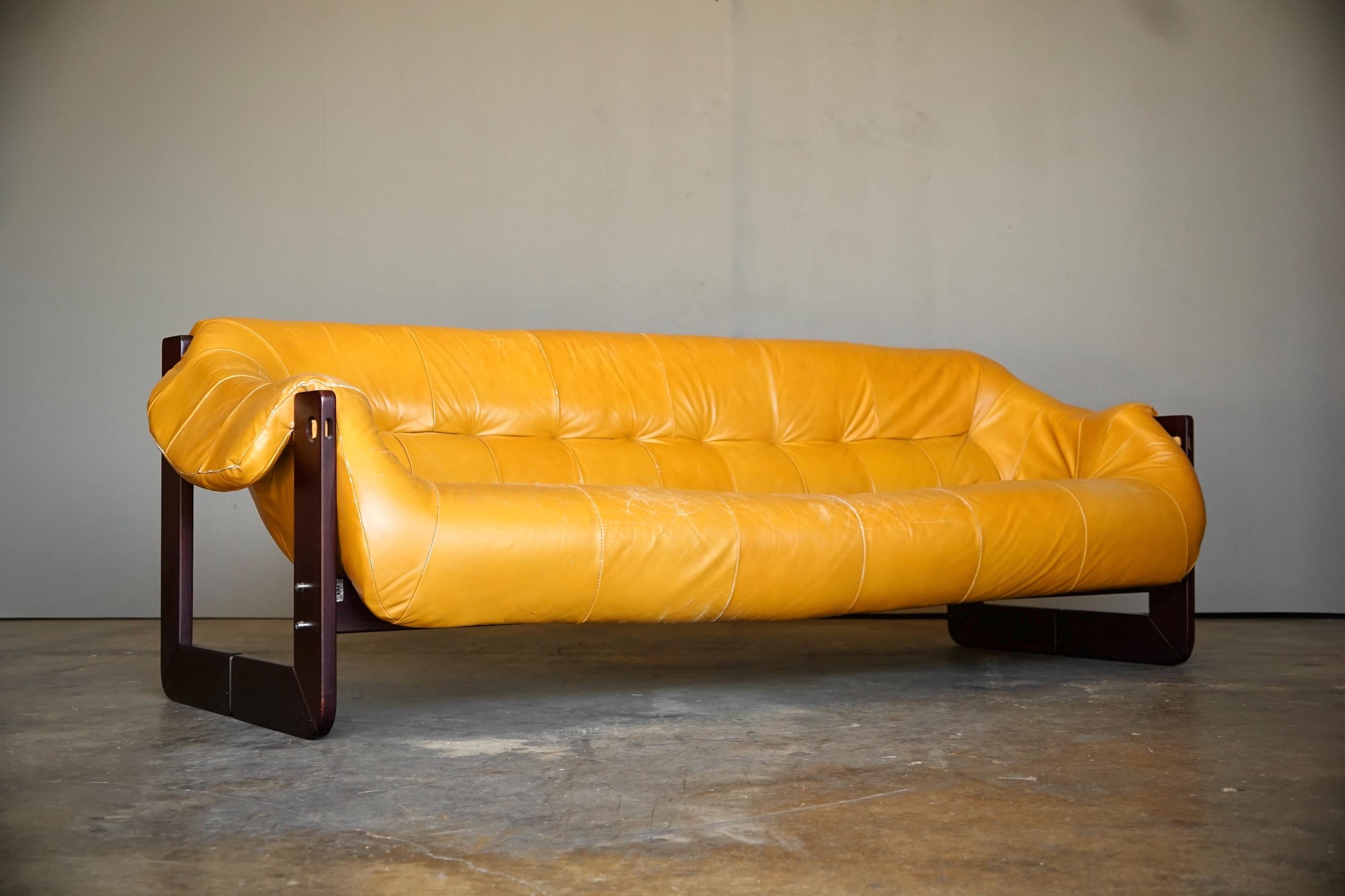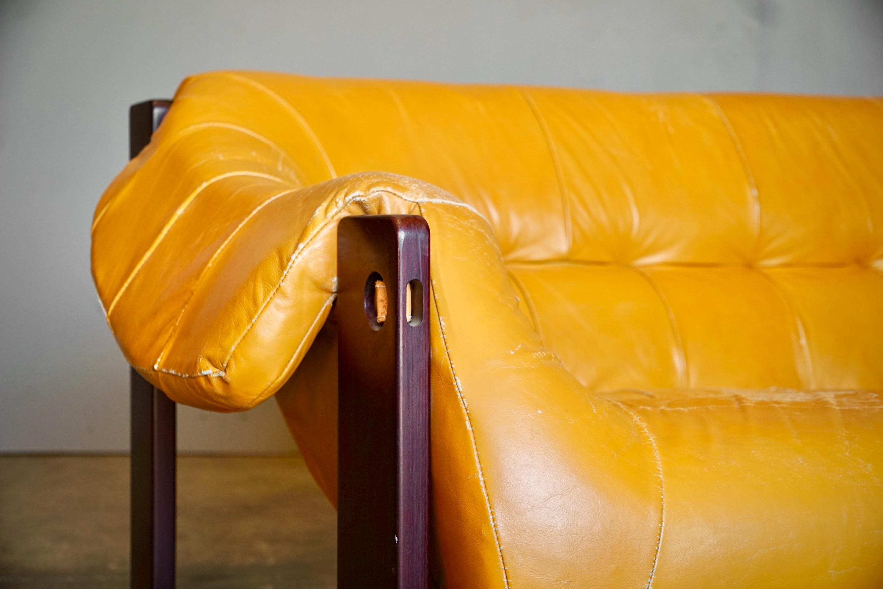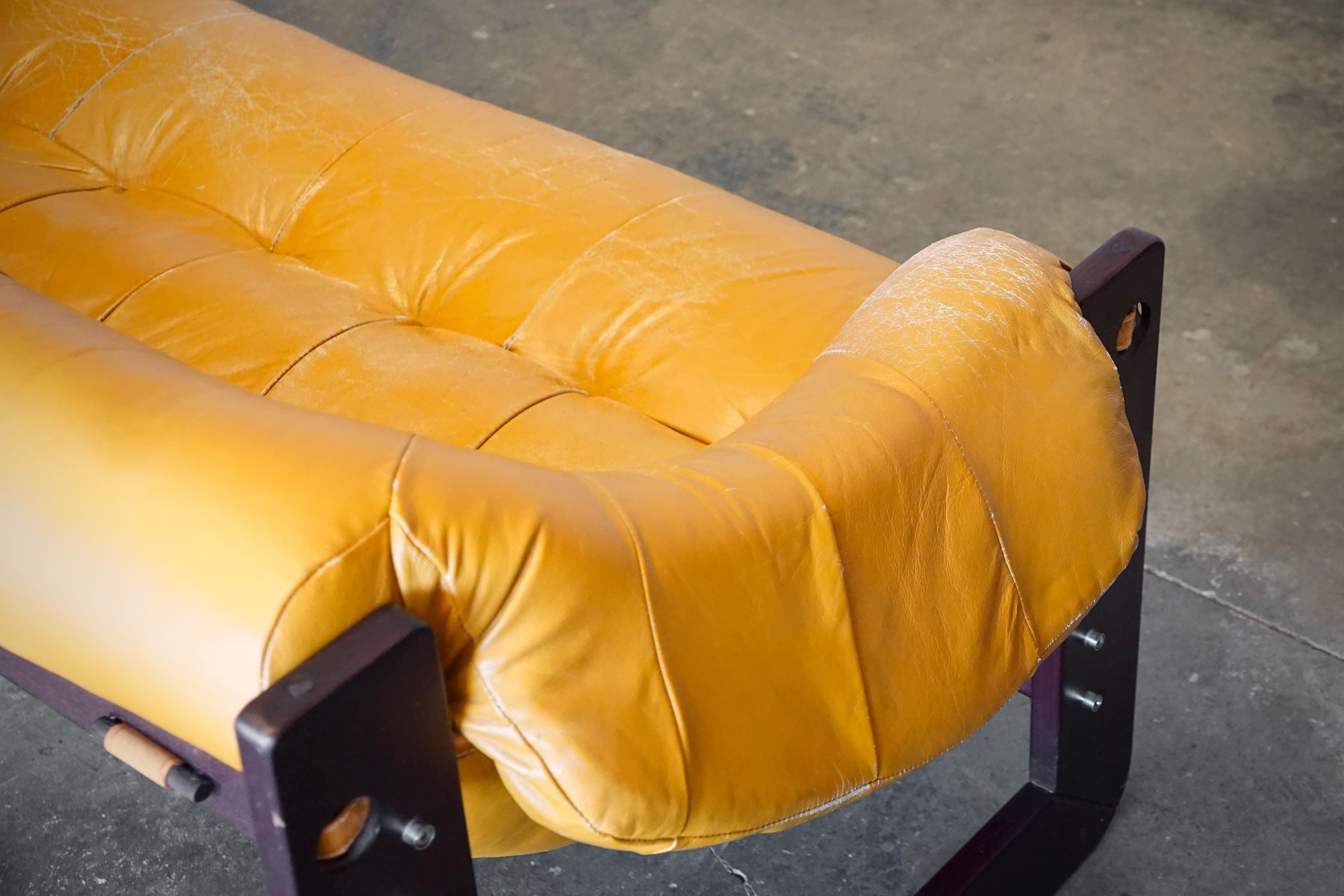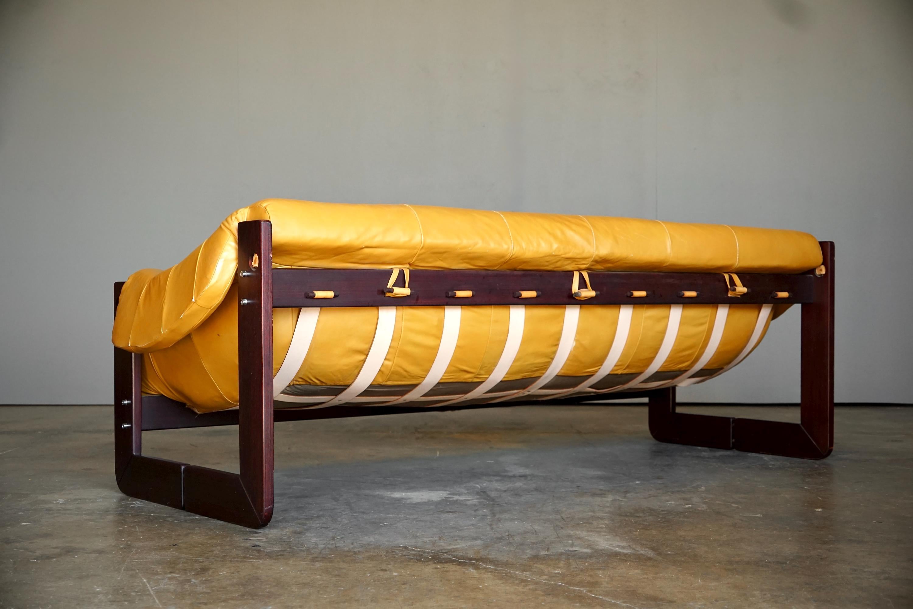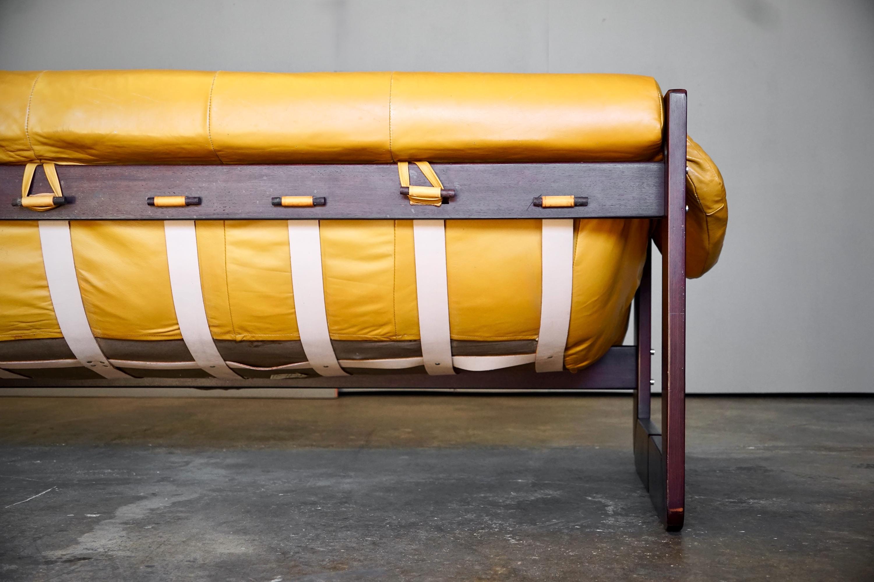 Leather sofa by Percival Lafer, c. 1960s, Brazil. The sofa features the original mustard yellow leather seat with a beautiful Brazilian hardware frame and chrome accents.
