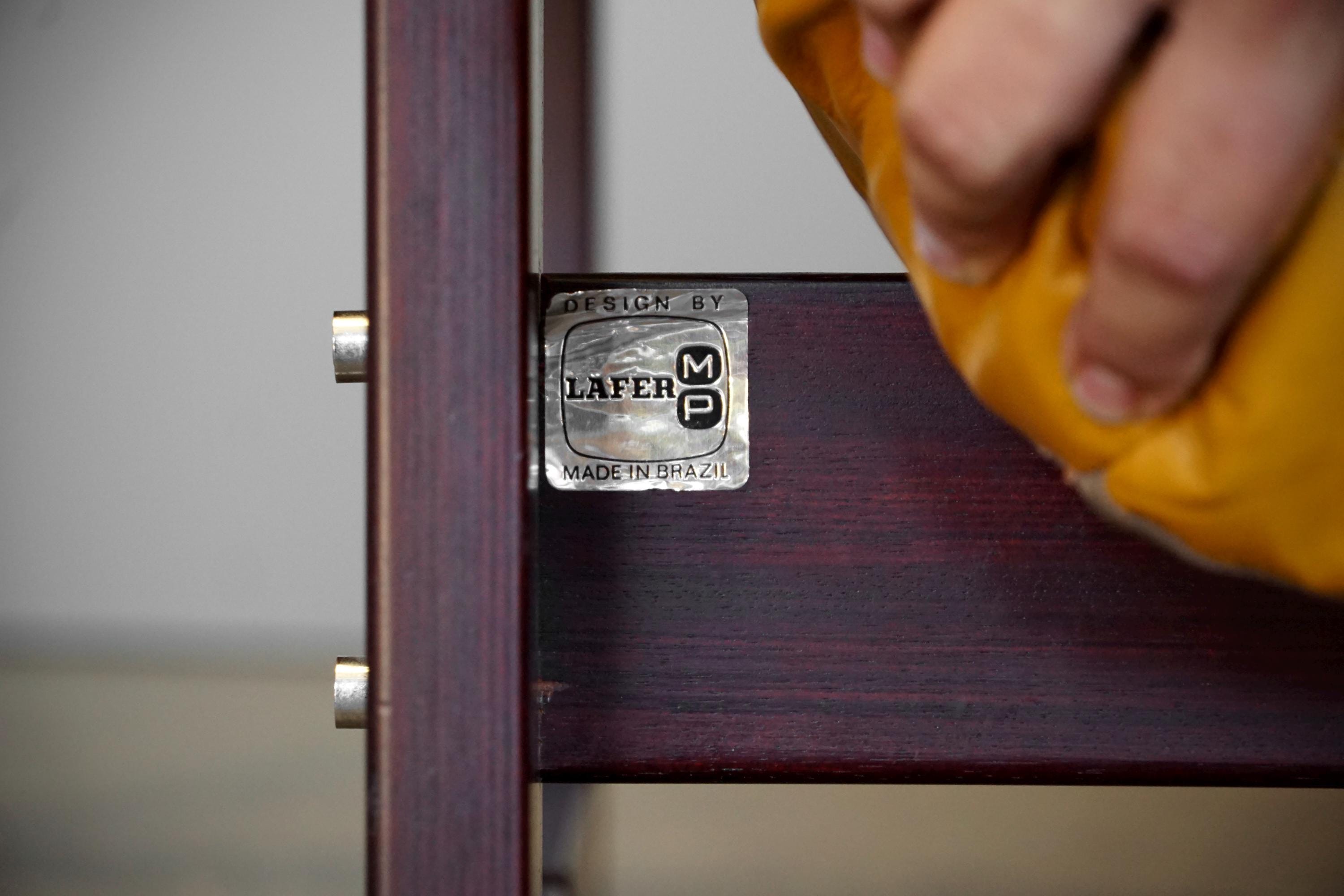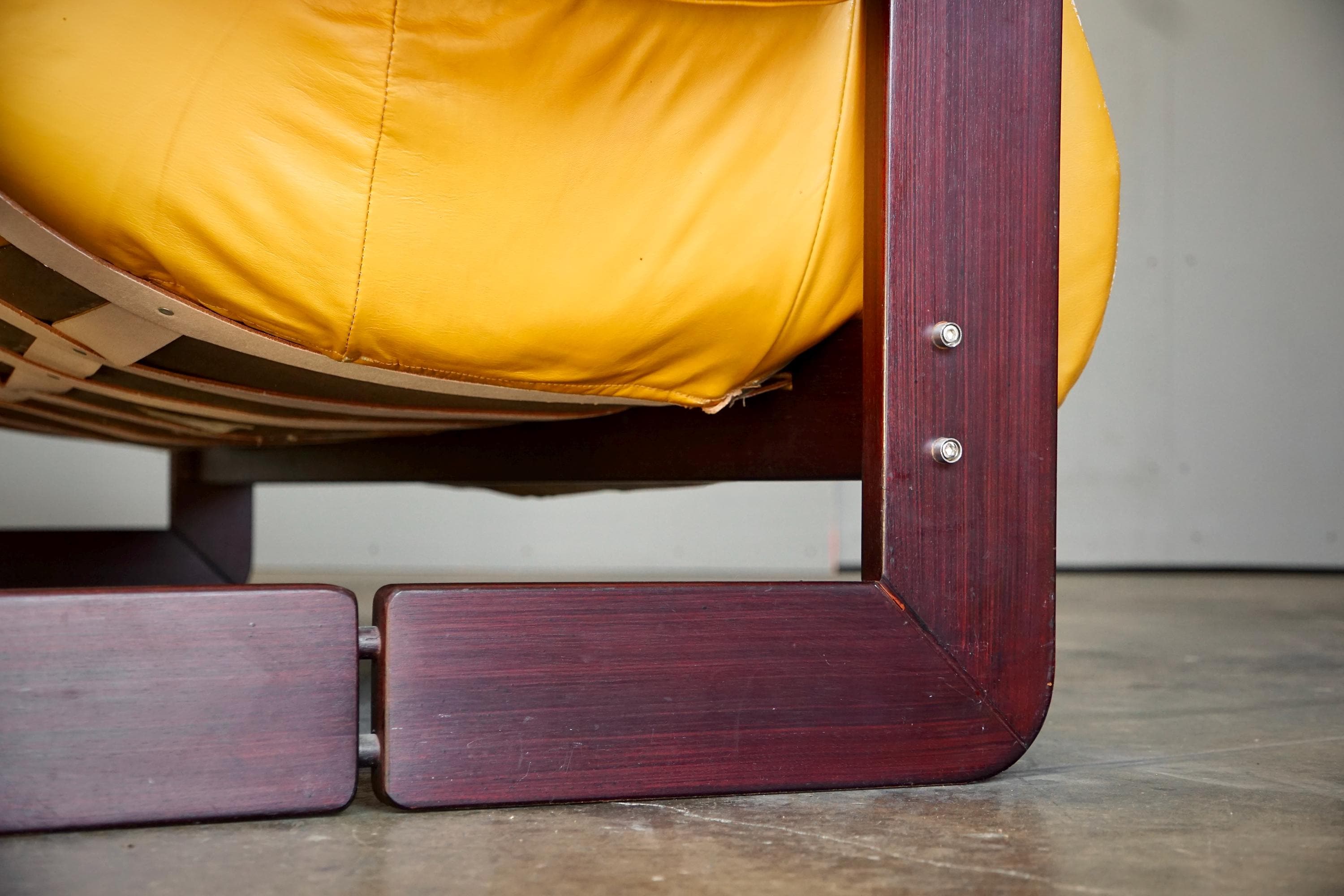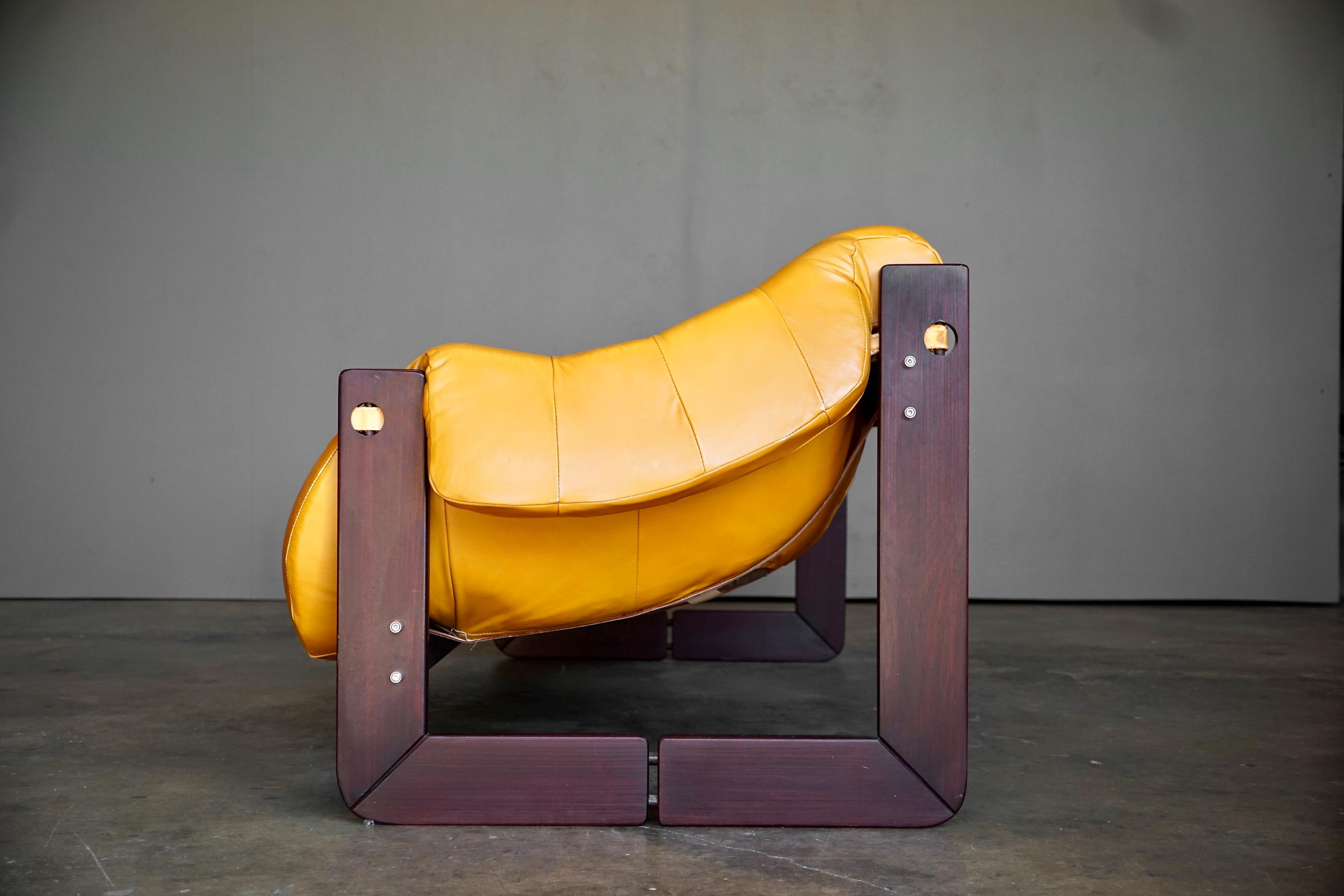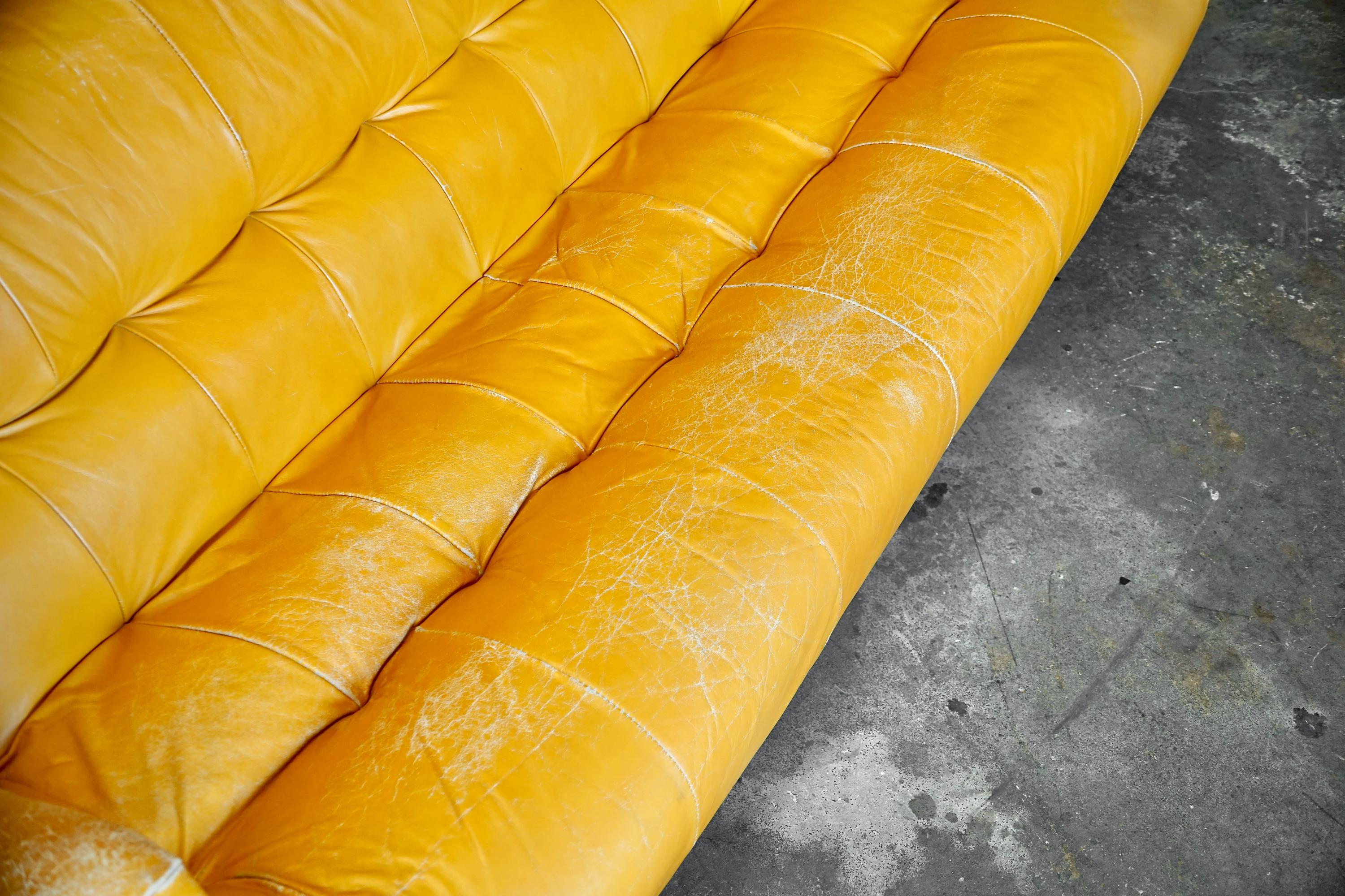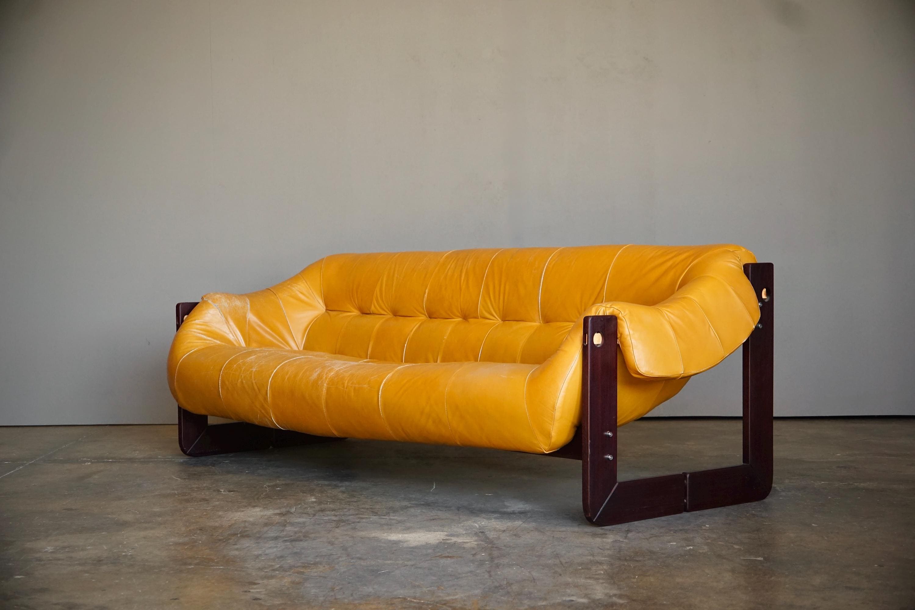 Leather sofa by Percival Lafer, c. 1960s, Brazil. The sofa features the original mustard yellow leather seat with a beautiful Brazilian hardware frame and chrome accents.