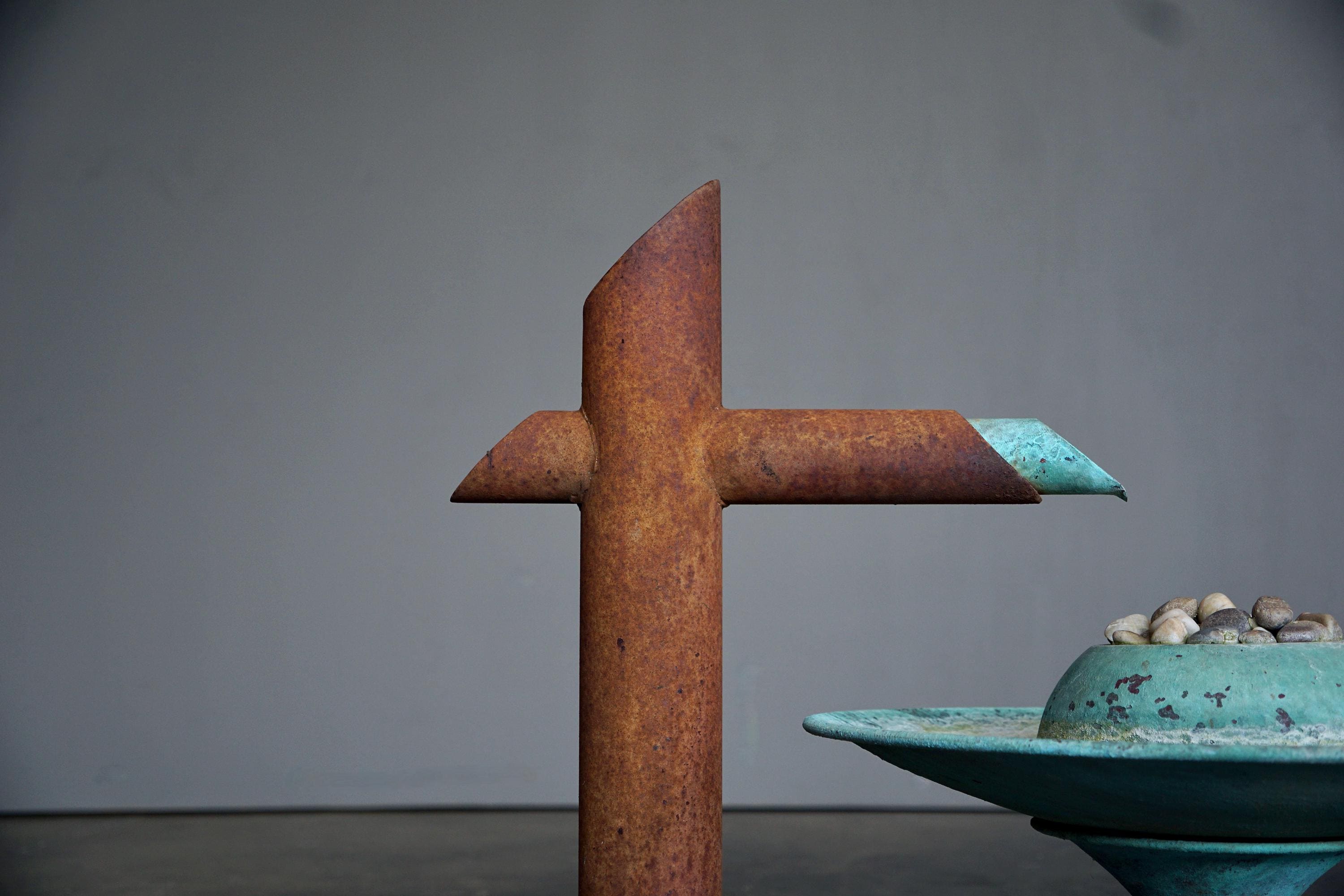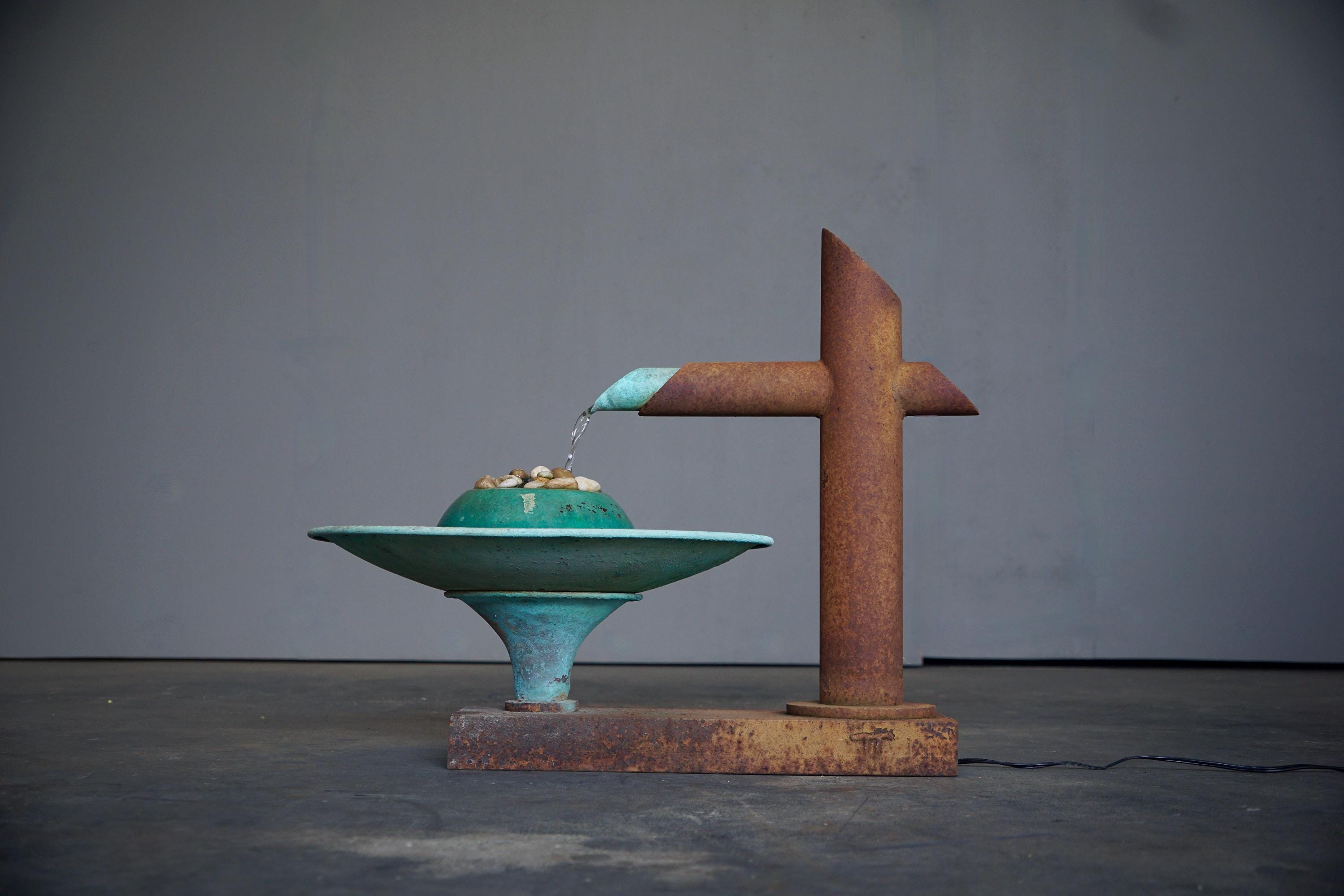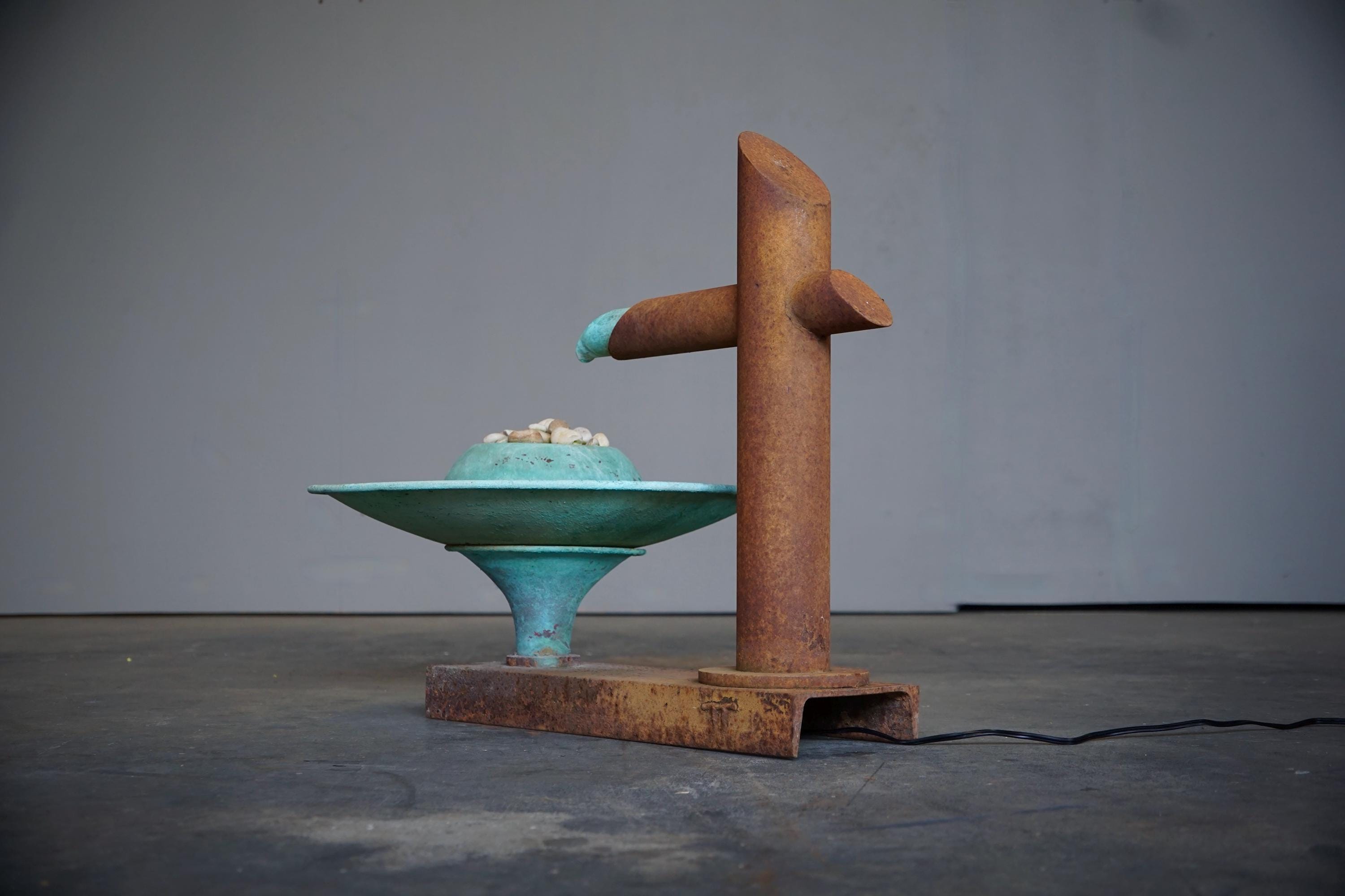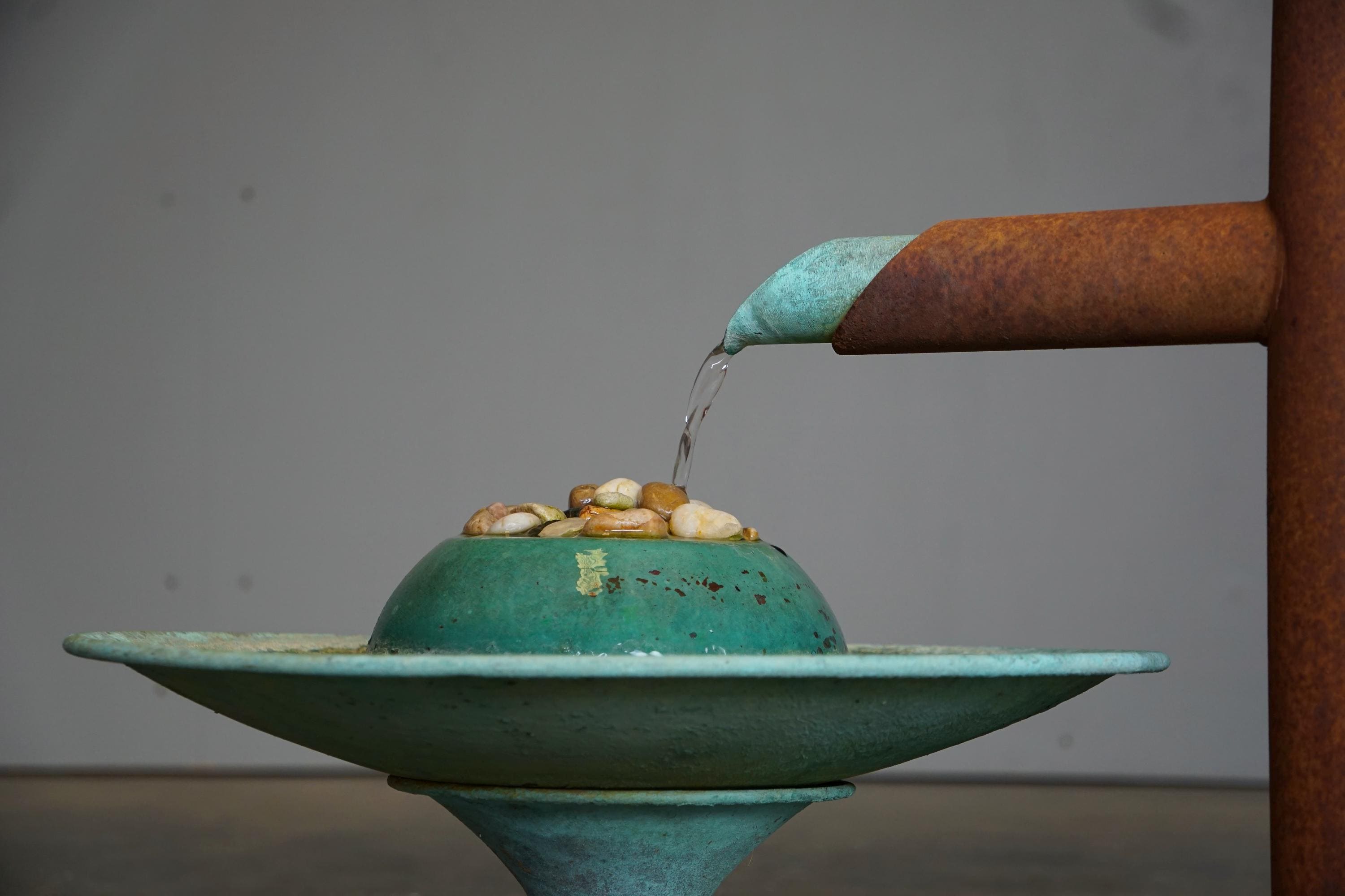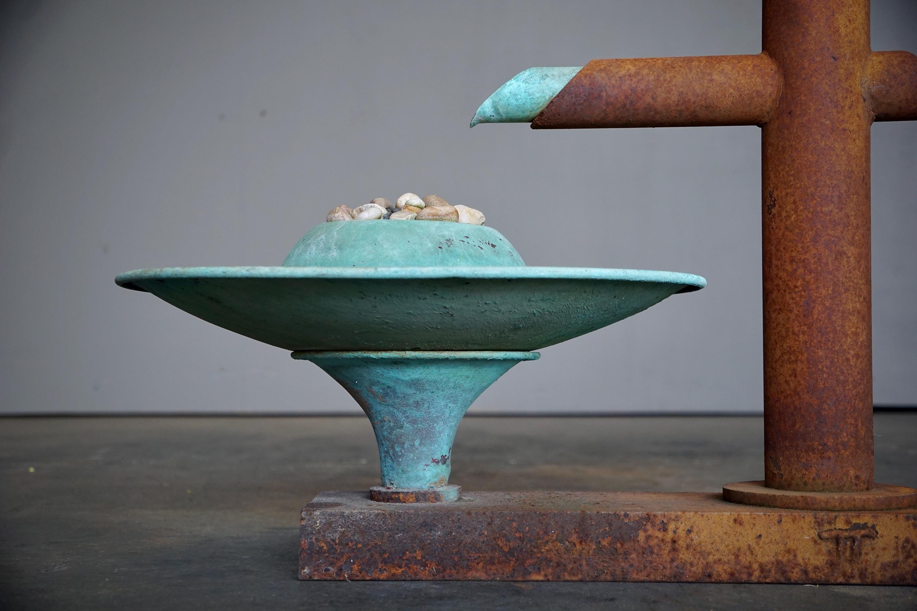 Wonderful patina throughout both steel and copper, new fountain pump and wiring, artist signature welded to steel base.