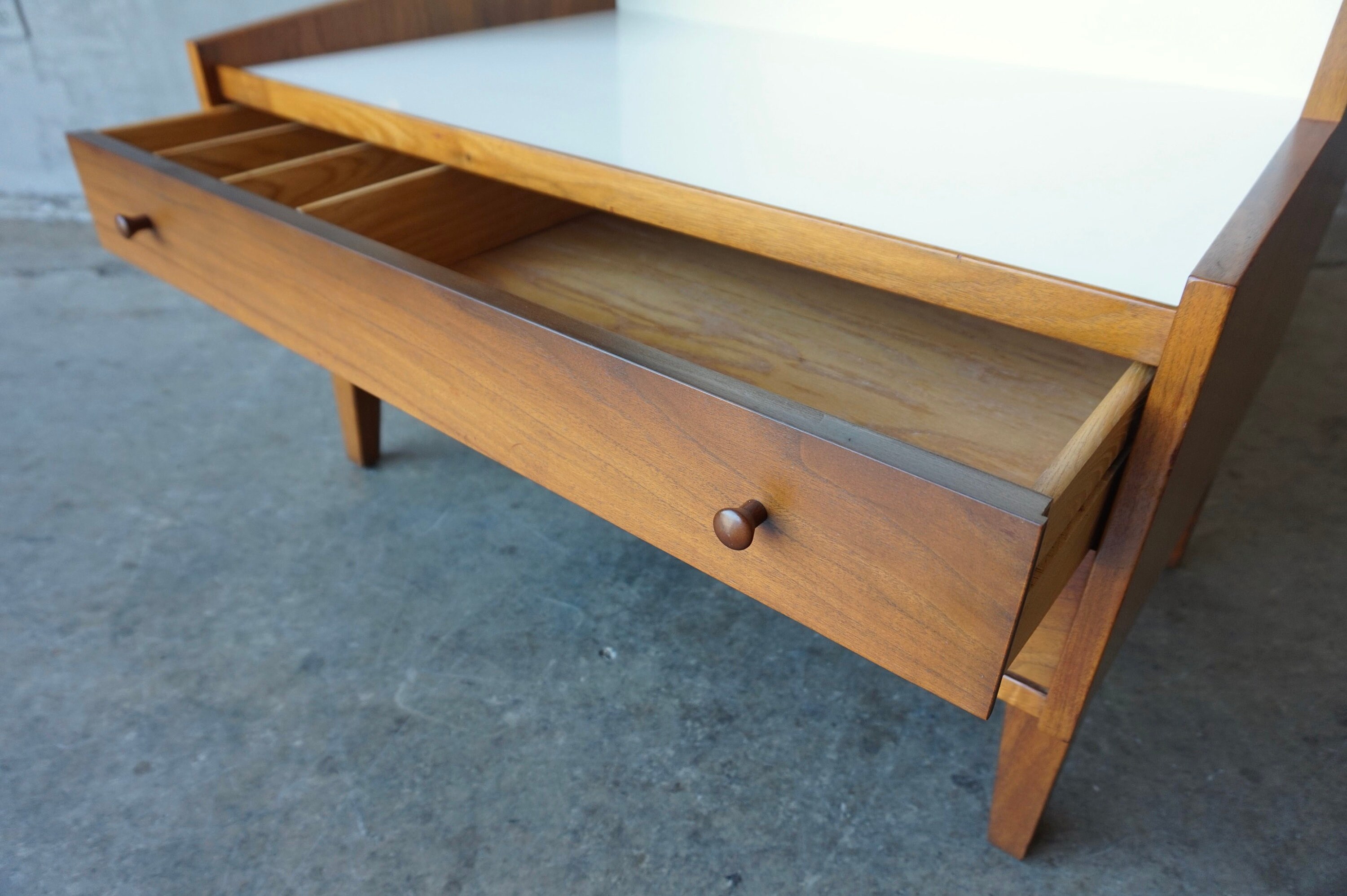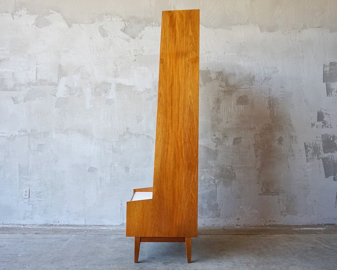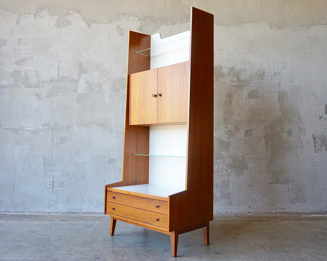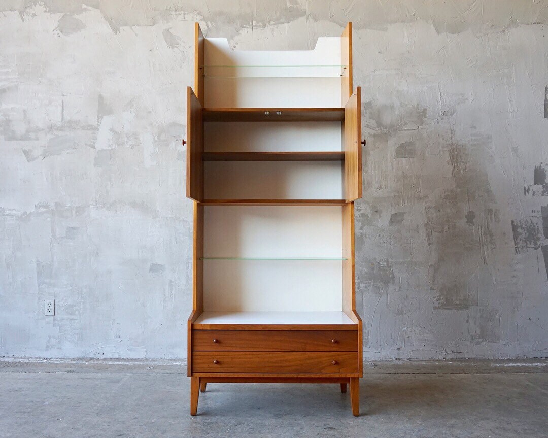 Features a walnut body, adjustable original ‘green glass’ shelve, white micarta bottom shelf and turner walnut drawer pulls.