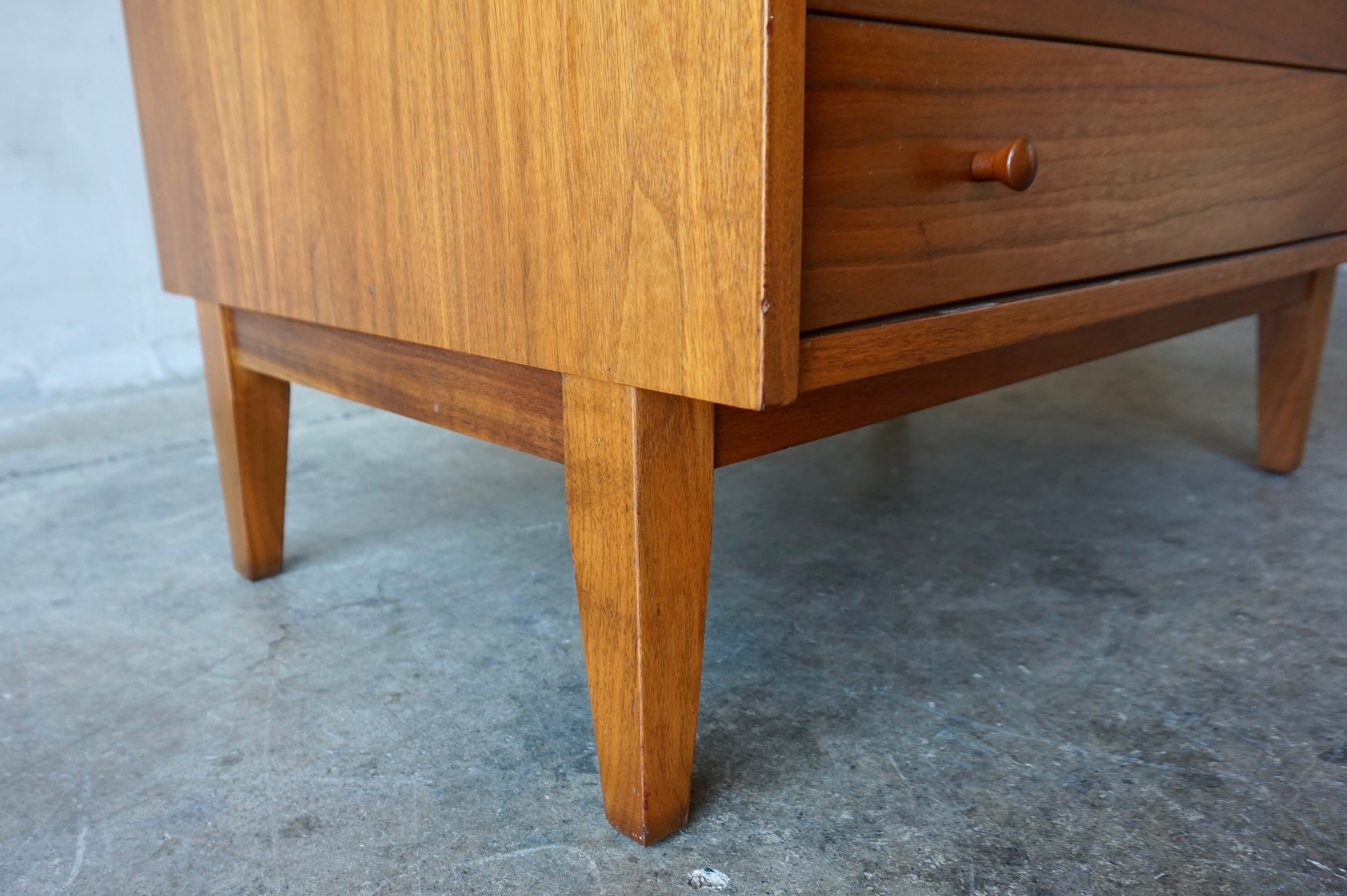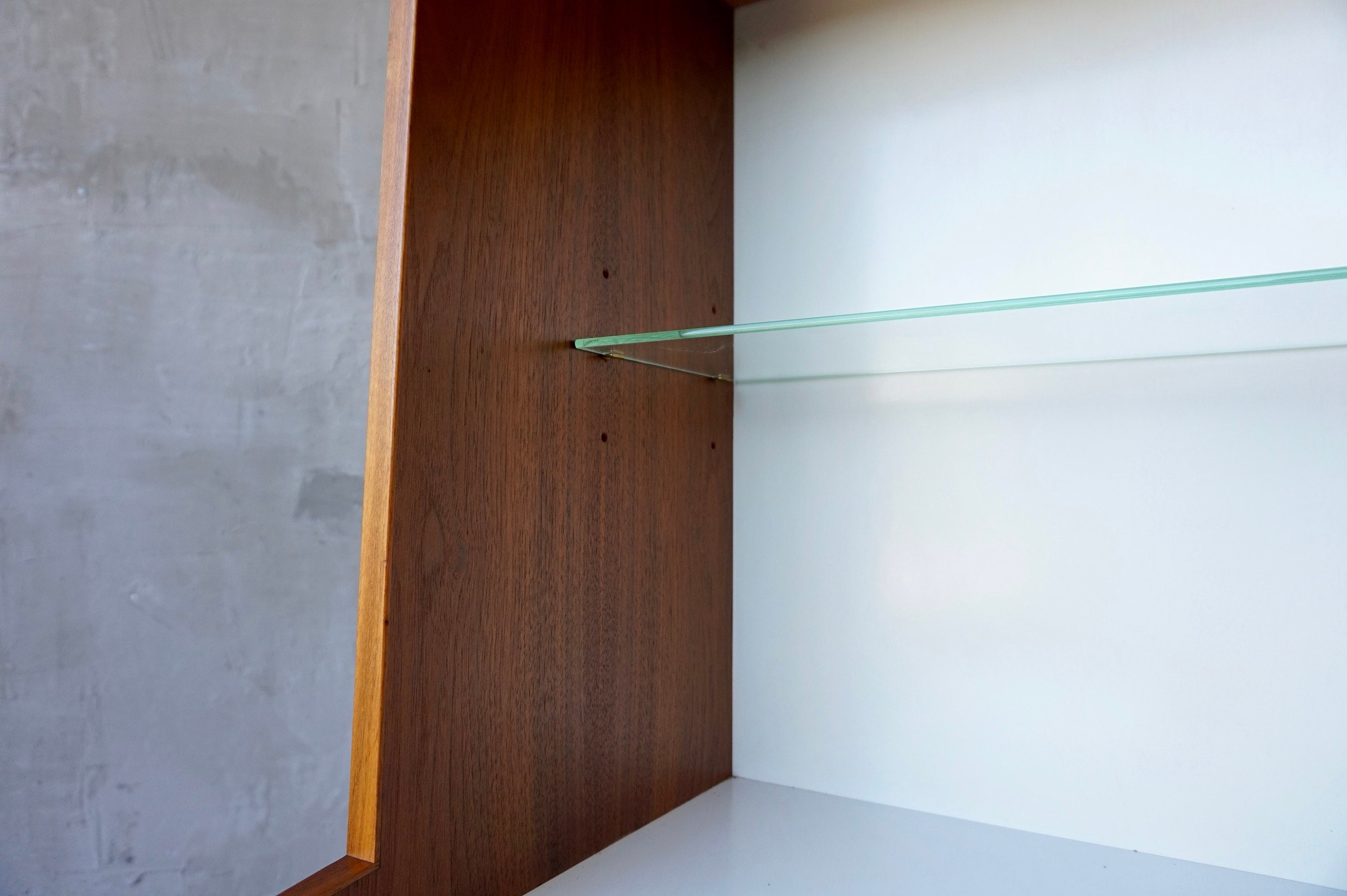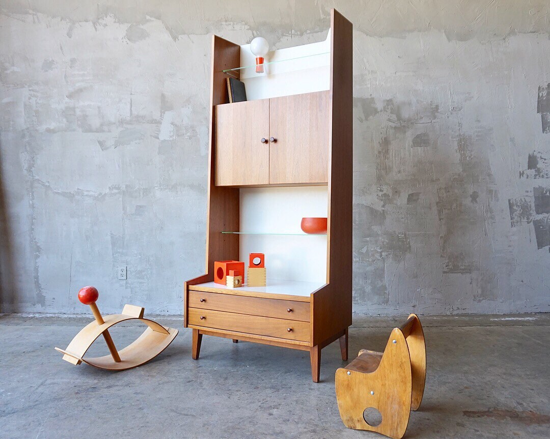 Features a walnut body, adjustable original ‘green glass’ shelve, white micarta bottom shelf and turner walnut drawer pulls.